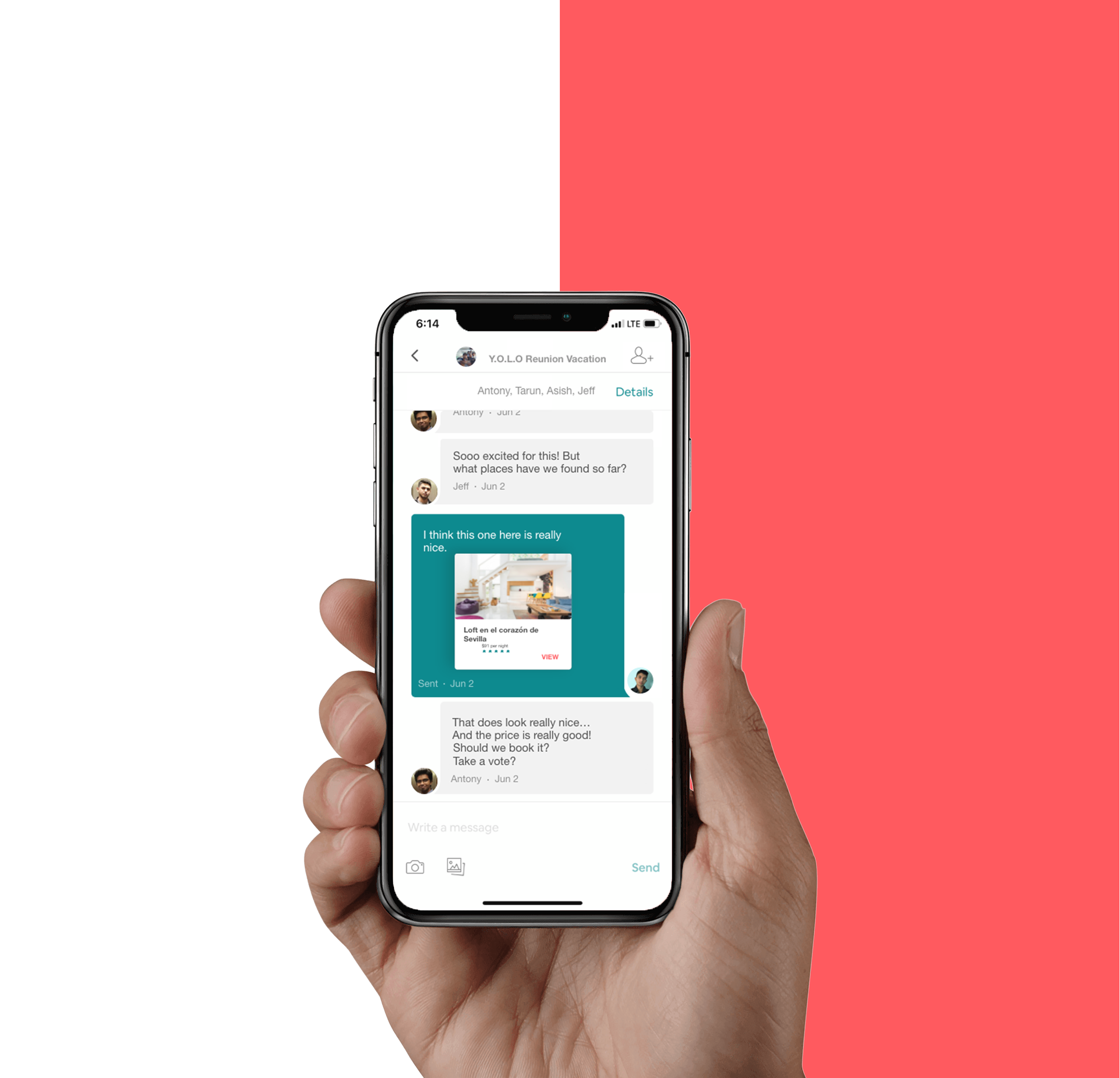 The current way of booking with airbnb in a group involves switching between airbnb and a group messaging app. This can be time consuming...and time is valuable.